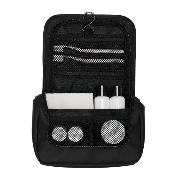 Hovedrommet på toalettmappen har en praktisk u-formet lukking og en toveis glidelås, som gir en enkel og oversiktlig tilgang til innholdet. Inne i hovedrommet finner du to glidelåslommer på klaffen, to nettinglommer og en åpen avdeling som passer til større gjenstander.