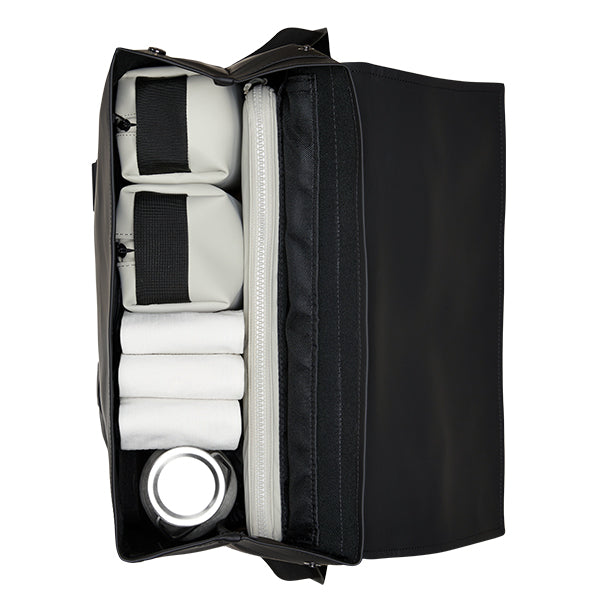 Klaffen låses fast i hempene med to karabinkroker, innvendig har sekken en lomme til en liten laptop.